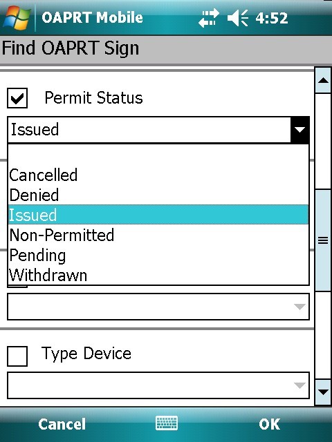 The OAPRT Mobile application provides tools for finding OAPRT records using any of the feature attributes as search criteria (Permit Number, Customer, City, District, and many others) or by making a spatial selection on the interactive map. Users can then update selected features, editing their attributes and/or capturing new location information using GPS or an attached laser range finder device. Additionally, users may add new records while in the field by capturing location information and entering as much attribute data as is available.